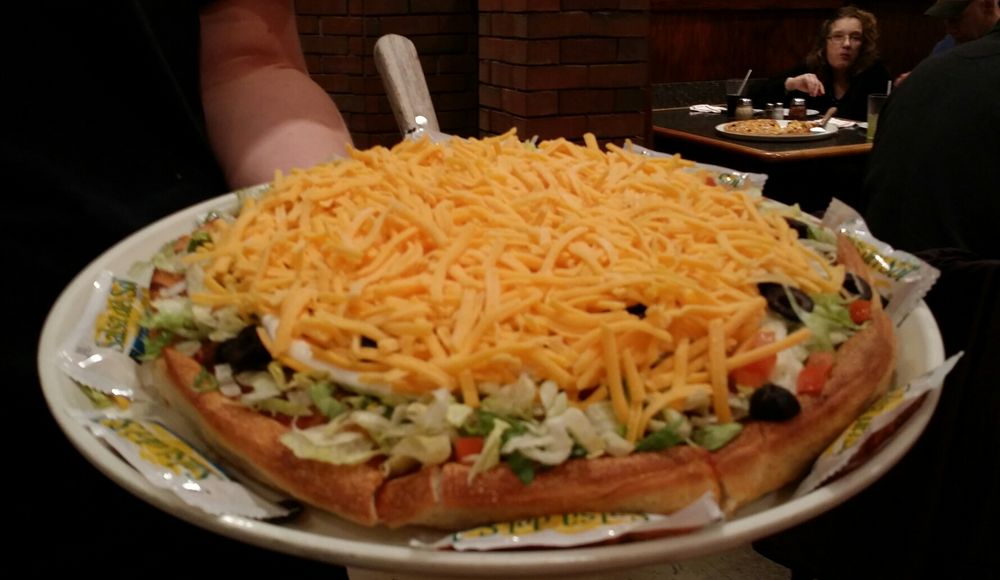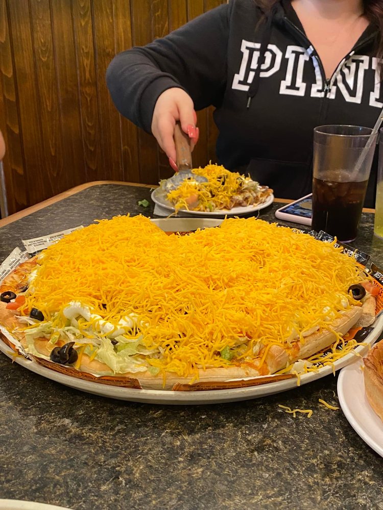 Beef, Black Olives, Onions, Lettuce, Tomatoes, Sour Cream, Taco Sauce, Cheddar Cheese & Mozzarella Cheese