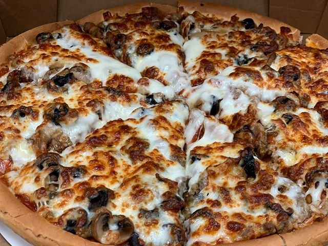 Beef, Pepperoni, Sausage, Onions, Black Olives, Mushrooms and Mozzarella Cheese