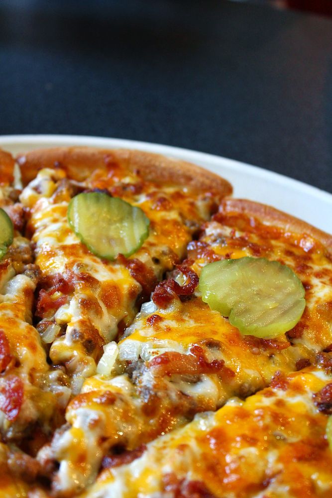 Beef, Bacon Bits, Onions, Pickles, Cheddar Cheese and Mozzarella Cheese