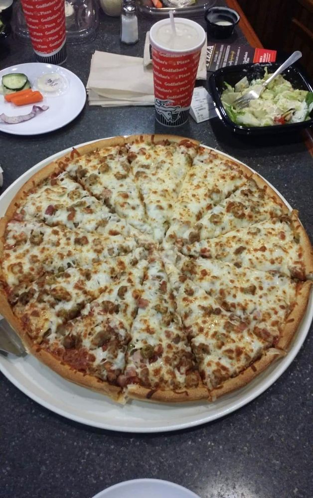Introducing the menu at Godfathers Pizza, a beloved Italian pizza joint in Dayton, OH. This casual restaurant offers a wide range of specialty pies like the All Meat Combo, Bacon Cheeseburger, and Hot Stuff. They also have super specialty pies including the Super Combo and Super Hawaiian. With options for vegetarians and value deals for groups, Godfathers Pizza is perfect for any occasion. Their menu features delicious combinations of toppings like beef, pepperoni, sausage, and more. The restaurant is wheelchair accessible, offers delivery and takeout, and has outdoor seating. Whether you're looking for a cozy dinner or a place to host a group gathering, Godfathers Pizza has you covered with their flavorful pies and excellent service.